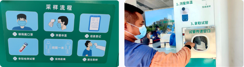 除此之外,“小屋”的外部還配置測(cè)溫器、掃碼器、試管傳遞窗口、擴(kuò)音器等便民設(shè)施,以及醫(yī)療廢物放置柜、試管放置柜、試管架放置處、手部消殺等采樣配置,功能齊全。