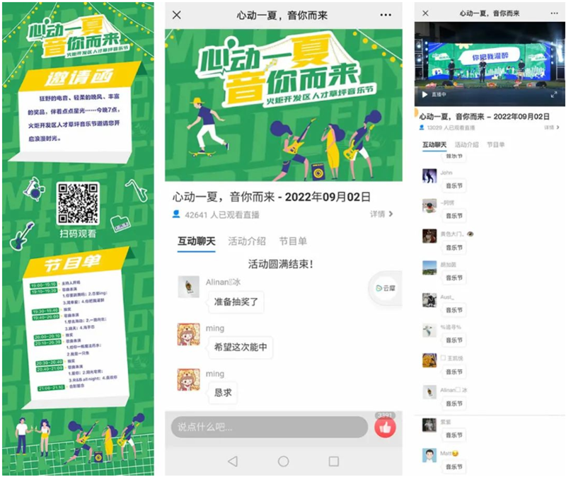 此次草坪音樂節(jié)采取線上直播+互動的形式舉辦,不僅邀請了麥靠北樂隊和三陳樂隊現(xiàn)場助興,唱響了14支優(yōu)美曲子,還穿插了抽獎環(huán)節(jié),開發(fā)區(qū)人才交流群也在同步互動,吸引了區(qū)內(nèi)來自星昊藥業(yè)、金城金素、利誠檢測、康天晟合、艾一生科、金馬游樂、明陽智能、中鐵裝備集團、藍軒氫能科技等企業(yè)上百名人才參加、超過4.2萬名觀眾觀看了直播。此次活動還得到了商家禮遇中山和有戲世界沉浸式互動影城的抽獎禮品的贊助。