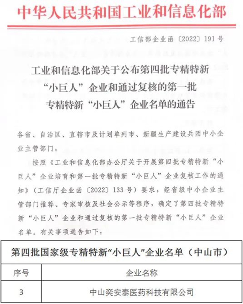 近日,第四批國家級(jí)專精特新“小巨人”企業(yè)名單發(fā)布,健康基地園區(qū)企業(yè)中山奕安泰醫(yī)藥科技有限公司(以下簡稱“奕安泰”)榜上有名。一直以來,健康基地把科技創(chuàng)新作為引領(lǐng)發(fā)展的第一動(dòng)力,打造差異化競(jìng)爭優(yōu)勢(shì),培育了一批有持續(xù)創(chuàng)新力和競(jìng)爭力的優(yōu)質(zhì)企業(yè)。目前,健康基地還擁有7家省級(jí)專精特新企業(yè)、2家市級(jí)專精特新及單項(xiàng)冠軍培育企業(yè)。