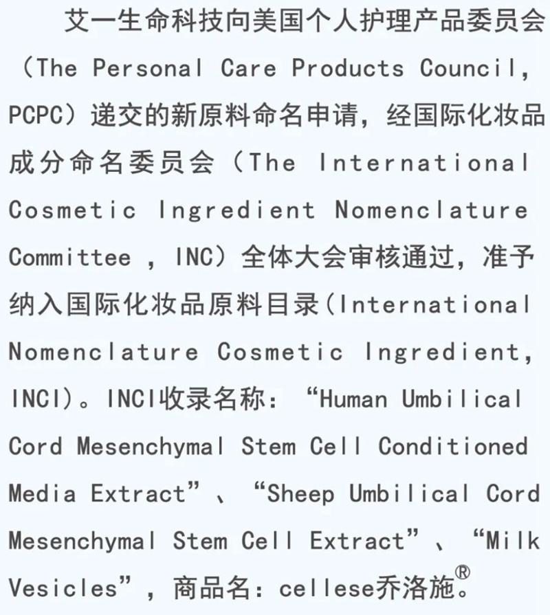 此次INCI的批準許可申請,艾一生命科學憑借嚴苛的產(chǎn)品標準、卓越的質量水平及安全有效等多重優(yōu)勢,歷經(jīng)重重驗證審核終獲成功,吸引了全球醫(yī)學界的關注。艾一生命科技計劃將為全球提供人臍帶間充質干細胞外囊泡的原料及相關功效化妝品,讓更多人受益于喬洛施的皮膚再生和防止老化。此次獲批,也得益于艾一生命科技科研團隊的潛心研究、不懈創(chuàng)新,彰顯了其團隊在人臍帶間充質干細胞外囊泡科研領域的“硬核”實力。