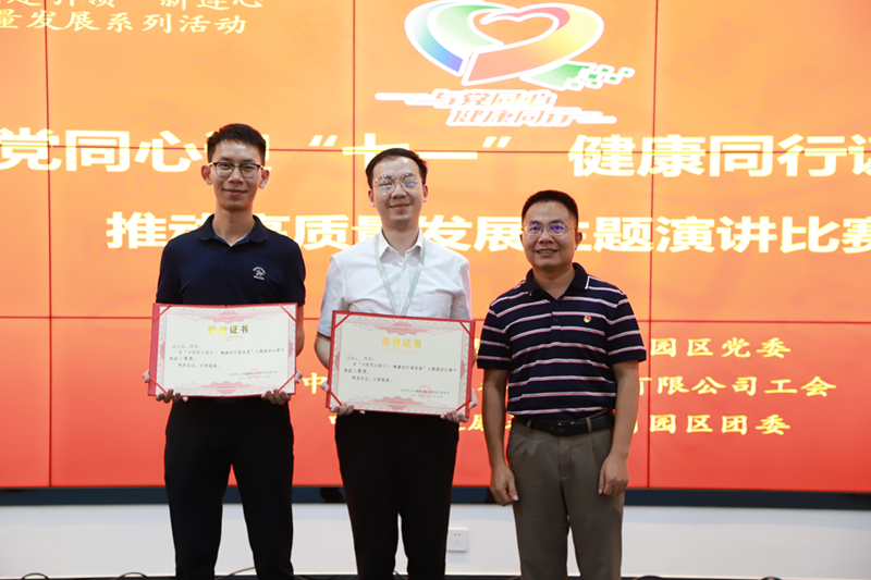 火炬開(kāi)發(fā)區(qū)黨群服務(wù)中心主任李慧為二等獎(jiǎng)獲得者林偉潮(民眾沙仔園區(qū)發(fā)展部)、鄭皓文(科技創(chuàng)新部)頒獎(jiǎng)
