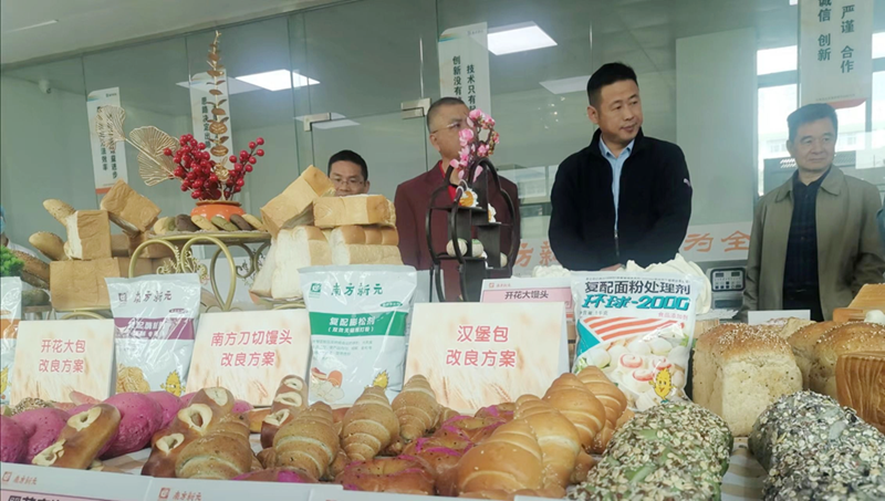 在南方新元公司新品展示臺上,擺放著各式各樣由該公司酶制劑改良方案的“漢堡包”“南方刀切饅頭”“開花大包”“老面饅頭”等新品。
