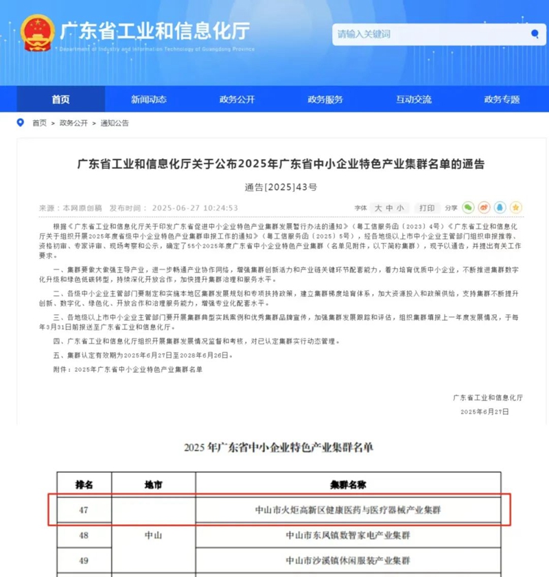 近日,廣東省工業(yè)和信息化廳正式發(fā)布《廣東省工業(yè)和信息化廳關(guān)于公布2025年廣東省中小企業(yè)特色產(chǎn)業(yè)集群名單的通告》。其中,中山火炬高新區(qū)健康醫(yī)藥與醫(yī)療器械產(chǎn)業(yè)集群成功入選。