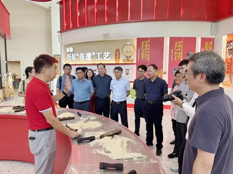 走進咀香園,中山市勞模和工匠人才創(chuàng)新工作室領銜人張延杰引導專家團參觀非遺技藝展示區(qū),了解傳統(tǒng)食品工業(yè)既要堅守“老味道”的底蘊,也要積極探索創(chuàng)新發(fā)展路徑的做法,共同探討傳統(tǒng)特色產業(yè)探索現(xiàn)代化創(chuàng)新發(fā)展的有效路徑。