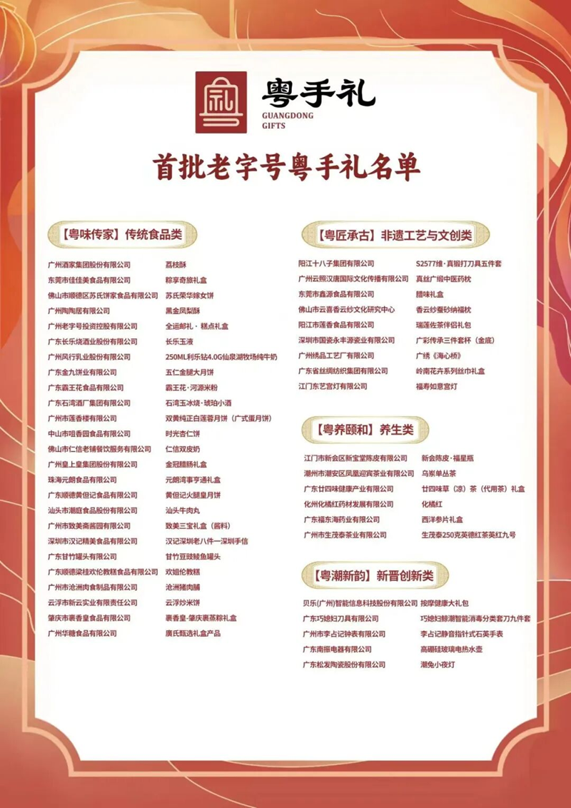 今年8月,為落實(shí)《廣東省促進(jìn)老字號(hào)創(chuàng)新發(fā)展行動(dòng)方案(2022-2025)》要求,促進(jìn)廣東老字號(hào)企業(yè)推出更多具有地域特色、文化內(nèi)涵、時(shí)代特點(diǎn)的“必購(gòu)必帶”產(chǎn)品,賦能老字號(hào)消費(fèi),推動(dòng)老字號(hào)品牌升級(jí),助力“粵品出粵”,提升“粵手禮”產(chǎn)品的市場(chǎng)競(jìng)爭(zhēng)力和品牌影響力,在廣東省商務(wù)廳、廣東省文化和旅游廳的指導(dǎo)下,廣東省老字號(hào)協(xié)會(huì)對(duì)“粵手禮”進(jìn)行產(chǎn)品征集、資格初審、專家評(píng)審、綜合考評(píng)等多個(gè)環(huán)節(jié)的層層篩選。涵蓋“粵味傳家”傳統(tǒng)食品類、“粵匠承古”非遺工藝與文創(chuàng)類、“粵養(yǎng)頤和”養(yǎng)生產(chǎn)品類、“粵潮新韻”新晉創(chuàng)新品類等,共計(jì)四大品類45件產(chǎn)品入圍。