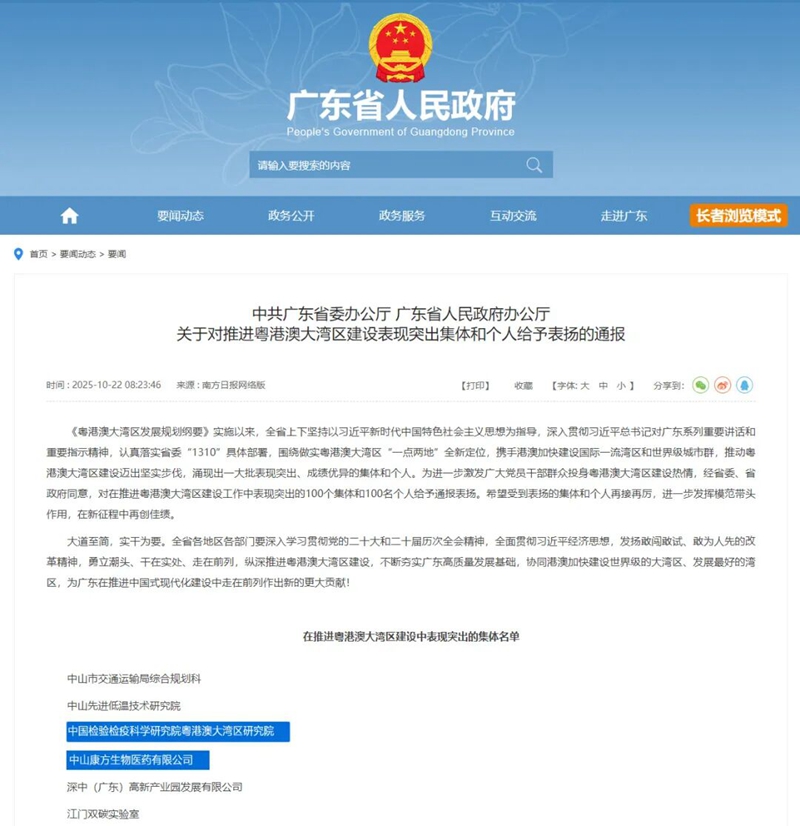近日,中共廣東省委辦公廳、廣東省人民政府辦公廳發(fā)布關(guān)于對推進粵港澳大灣區(qū)建設(shè)表現(xiàn)突出的集體和個人給予表揚的通報。其中,健康基地園區(qū)的中國檢驗檢疫科學(xué)研究院粵港澳大灣區(qū)研究院、中山康方生物醫(yī)藥有限公司雙雙獲評為“推進粵港澳大灣區(qū)建設(shè)表現(xiàn)突出集體”。