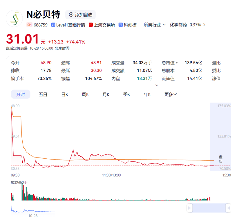 上市首日,必貝特醫(yī)藥開(kāi)盤(pán)價(jià)為48.90元/股,較發(fā)行價(jià)17.78元/股大幅上漲174.91%,截至今日收盤(pán),股價(jià)報(bào)31.01元,總市值139.56億元。