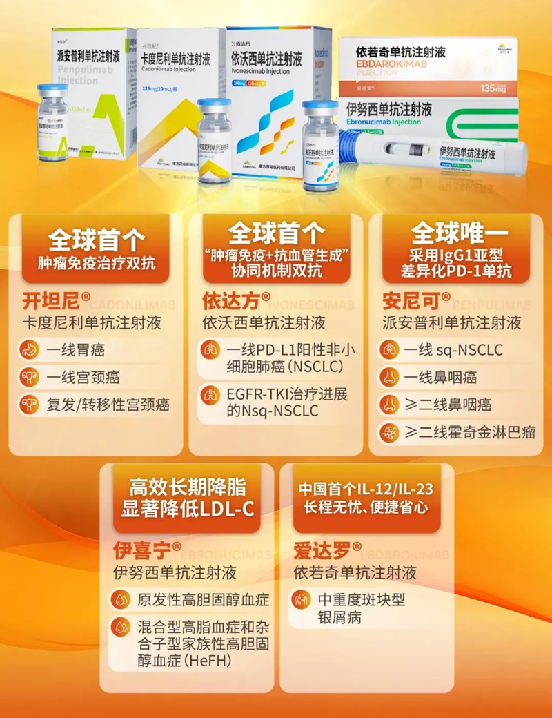 繼被納入2024版國家醫(yī)保目錄,康方生物兩款首創(chuàng)雙抗此次醫(yī)保準入再度刷新行業(yè)高度:依沃西(依達方®)新增一線PD-L1陽性非小細胞肺癌適應(yīng)癥。針對該適應(yīng)癥,依沃西在與“藥王”帕博利珠單抗的頭對頭試驗中,相比帕博利珠單抗顯著降低患者疾病進展風險達49%,成為全球首例擊敗K藥的中國創(chuàng)新藥;卡度尼利(開坦尼®)新增胃癌、宮頸癌一線適應(yīng)癥,填補免疫治療在全人群應(yīng)用的空白。首次談判的派安普利單抗、依若奇單抗、伊努西單抗亦悉數(shù)入圍,覆蓋鼻咽癌、銀屑病、高膽固醇血癥等領(lǐng)域。