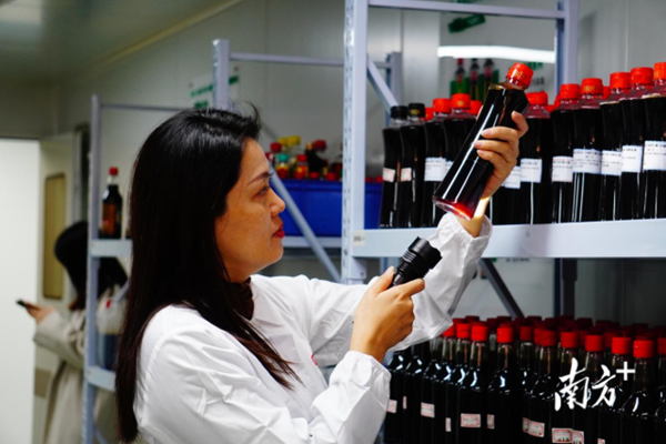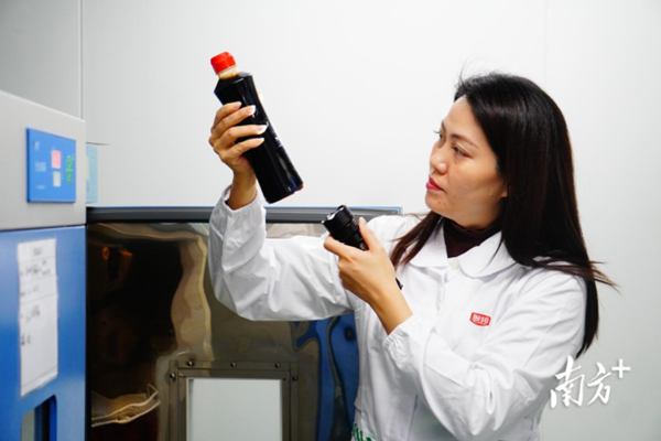 符姜燕觀察醬油研發(fā)樣品情況。