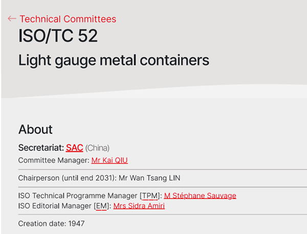 ISO成立于1947年,總部設(shè)在瑞士日內(nèi)瓦,是世界上最大的國(guó)際標(biāo)準(zhǔn)化機(jī)構(gòu),與國(guó)際電工委員會(huì)(IEC)、國(guó)際電信聯(lián)盟(ITU)并稱三大國(guó)際標(biāo)準(zhǔn)化組織。ISO現(xiàn)有175個(gè)成員,共有標(biāo)準(zhǔn)化技術(shù)機(jī)構(gòu)829個(gè)(含技術(shù)委員會(huì)TC和分技術(shù)委員會(huì)SC)。ISO/TC 52成立于1947年,是ISO最早成立的技術(shù)委員會(huì)之一, 負(fù)責(zé)標(biāo)稱壁厚不大于0.49mm的薄壁金屬容器(廣泛應(yīng)用于食品、飲料、藥品、化妝品以及日用化學(xué)品等領(lǐng)域)領(lǐng)域的國(guó)際標(biāo)準(zhǔn)化工作。其成員主要來自德國(guó)、法國(guó)、英國(guó)、意大利、荷蘭、日本、韓國(guó)等39個(gè)國(guó)家,包含了11個(gè)積極成員國(guó)和28個(gè)觀察成員國(guó)。該技術(shù)委員會(huì)已發(fā)布11項(xiàng)國(guó)際標(biāo)準(zhǔn),其中三項(xiàng)由中國(guó)主導(dǎo)制定。秘書處設(shè)在中國(guó),由中國(guó)食品發(fā)酵工業(yè)研究院有限公司承擔(dān)秘書處工作和國(guó)內(nèi)技術(shù)對(duì)口工作。
